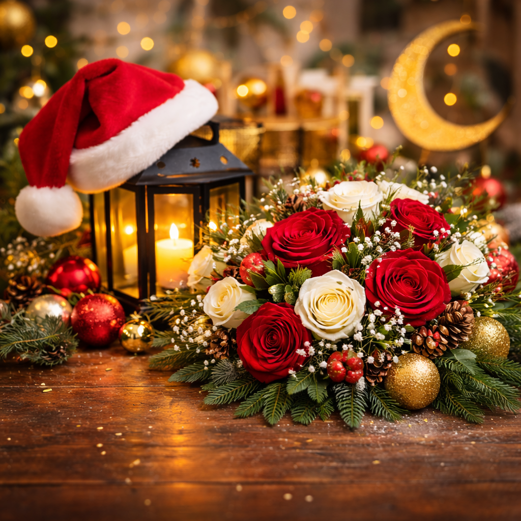 بوكيه ألوان كريسماس - ورد أحمر وأبيض - بوكس ورد شتوي - ورد مع زينة شتوية - باقة رأس السنة