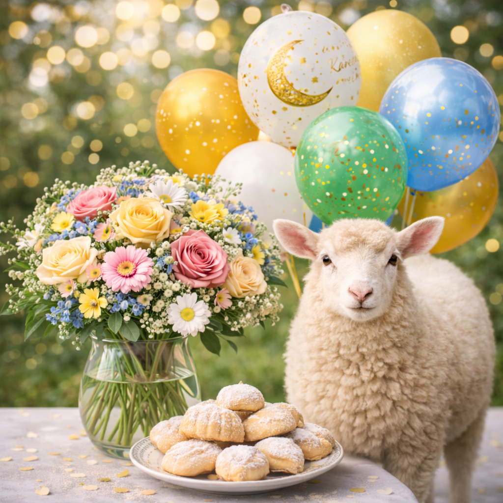 بوكيه عيد مبارك - ورد للزيارات - بوكس ورد مع كحك - ورد مع بلونات - باقة مبهجة للأهل - ورد بتغليف فاخر
